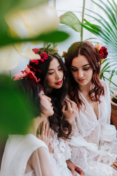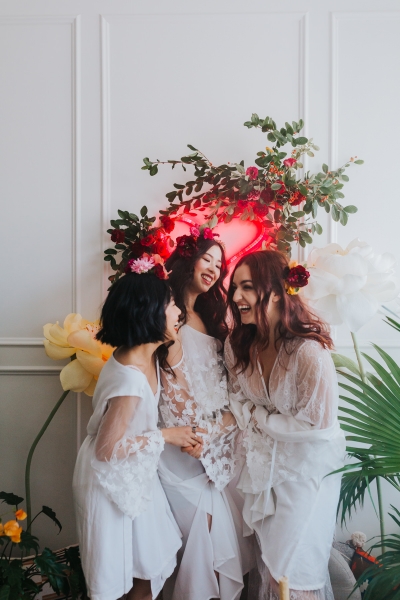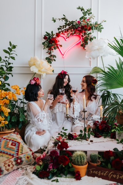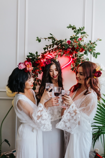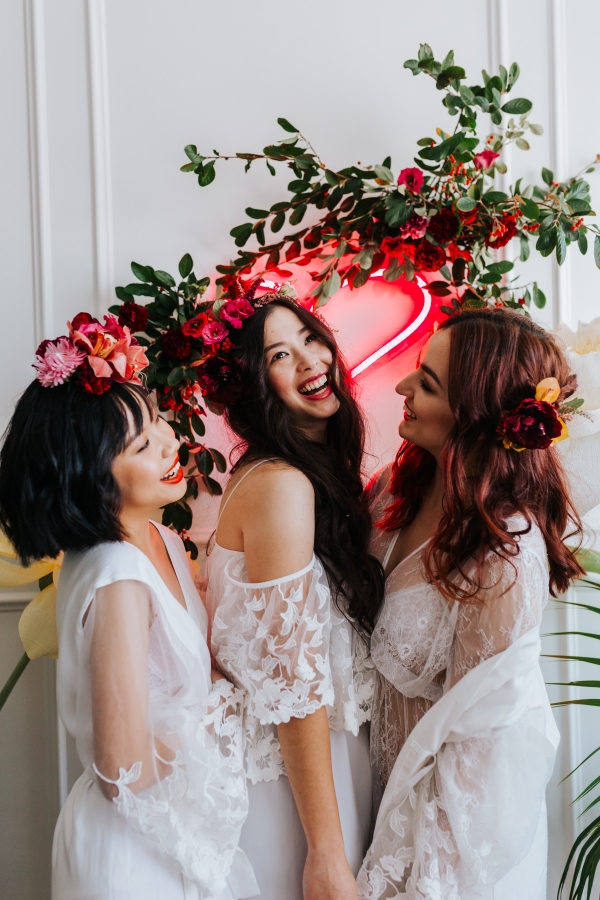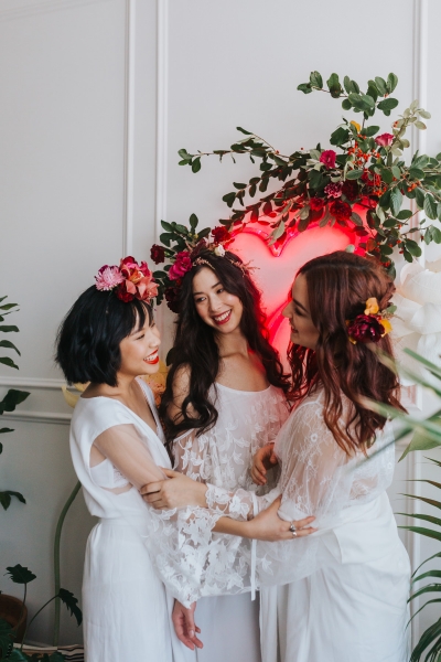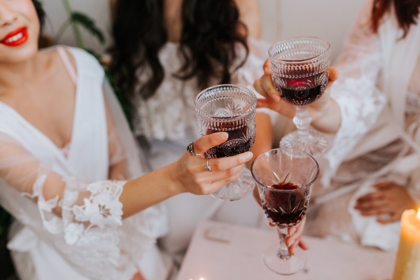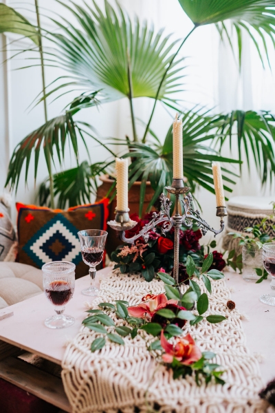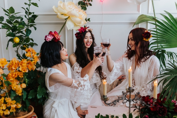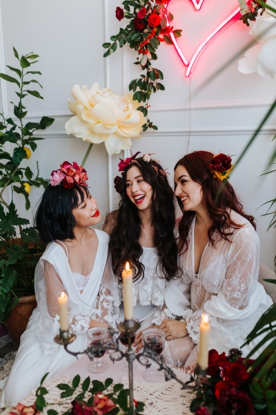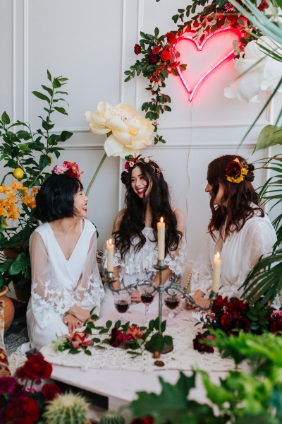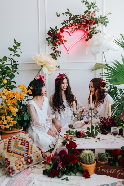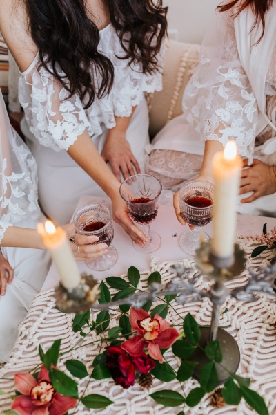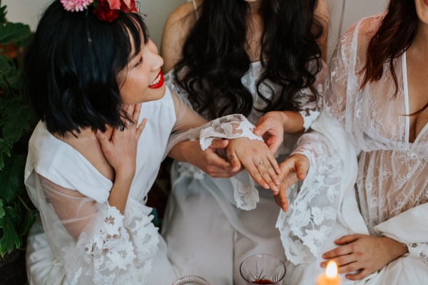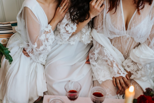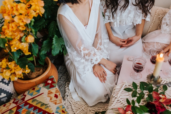 Led by hand-lettered signage created by Signed by Bird, our three guests (dressed in white robes from Cookies & Ry with beautiful hair and makeup by Morgan Hair Co and Sonia Allen) were guided to a lounge area of woven geometric rugs, a low table and tropical blooms, succulents and cacti. They toasted to the bride with ornate glasses filled with red wine, sitting by the light of tapered candles held in vintage candelabras.