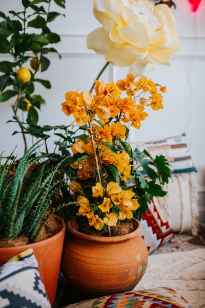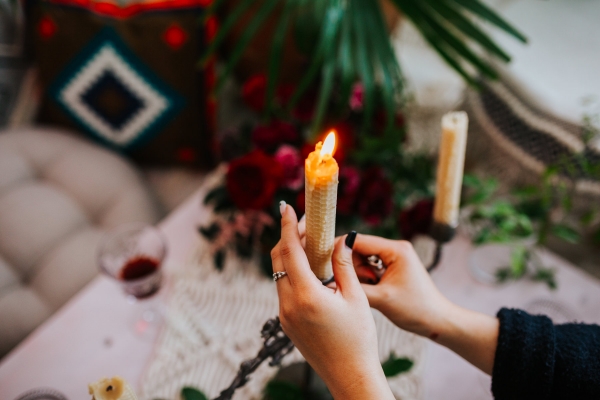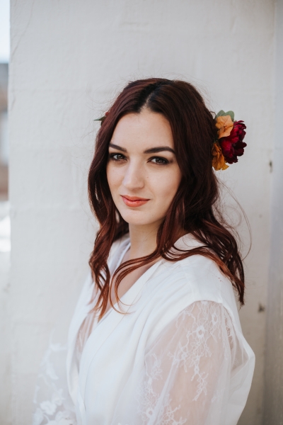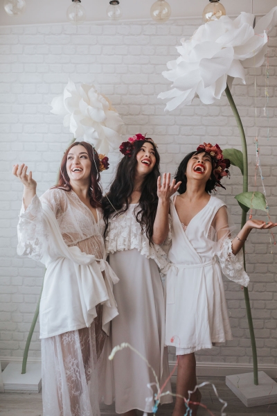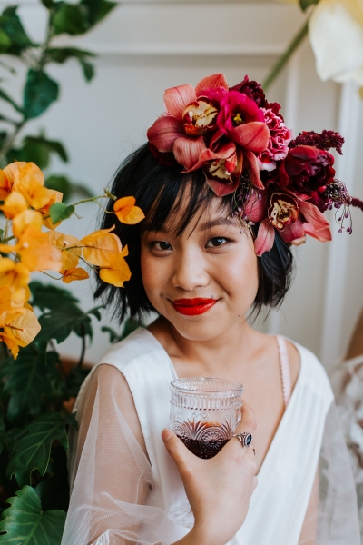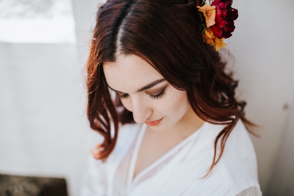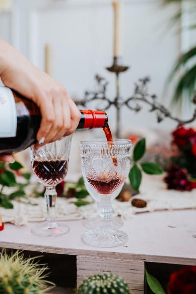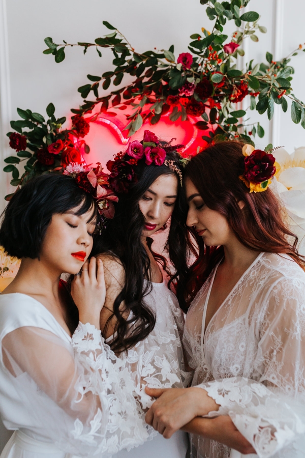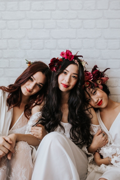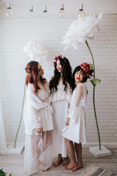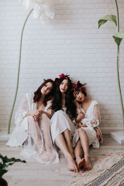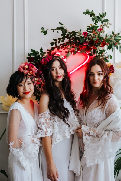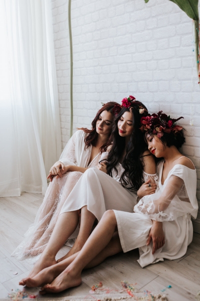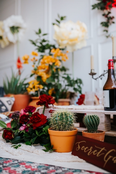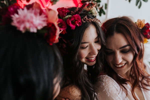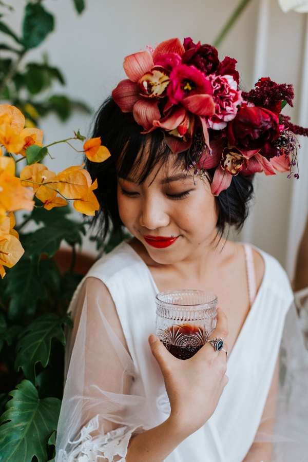 Led by hand-lettered signage created by Signed by Bird, our three guests (dressed in white robes from Cookies & Ry with beautiful hair and makeup by Morgan Hair Co and Sonia Allen) were guided to a lounge area of woven geometric rugs, a low table and tropical blooms, succulents and cacti. They toasted to the bride with ornate glasses filled with red wine, sitting by the light of tapered candles held in vintage candelabras.